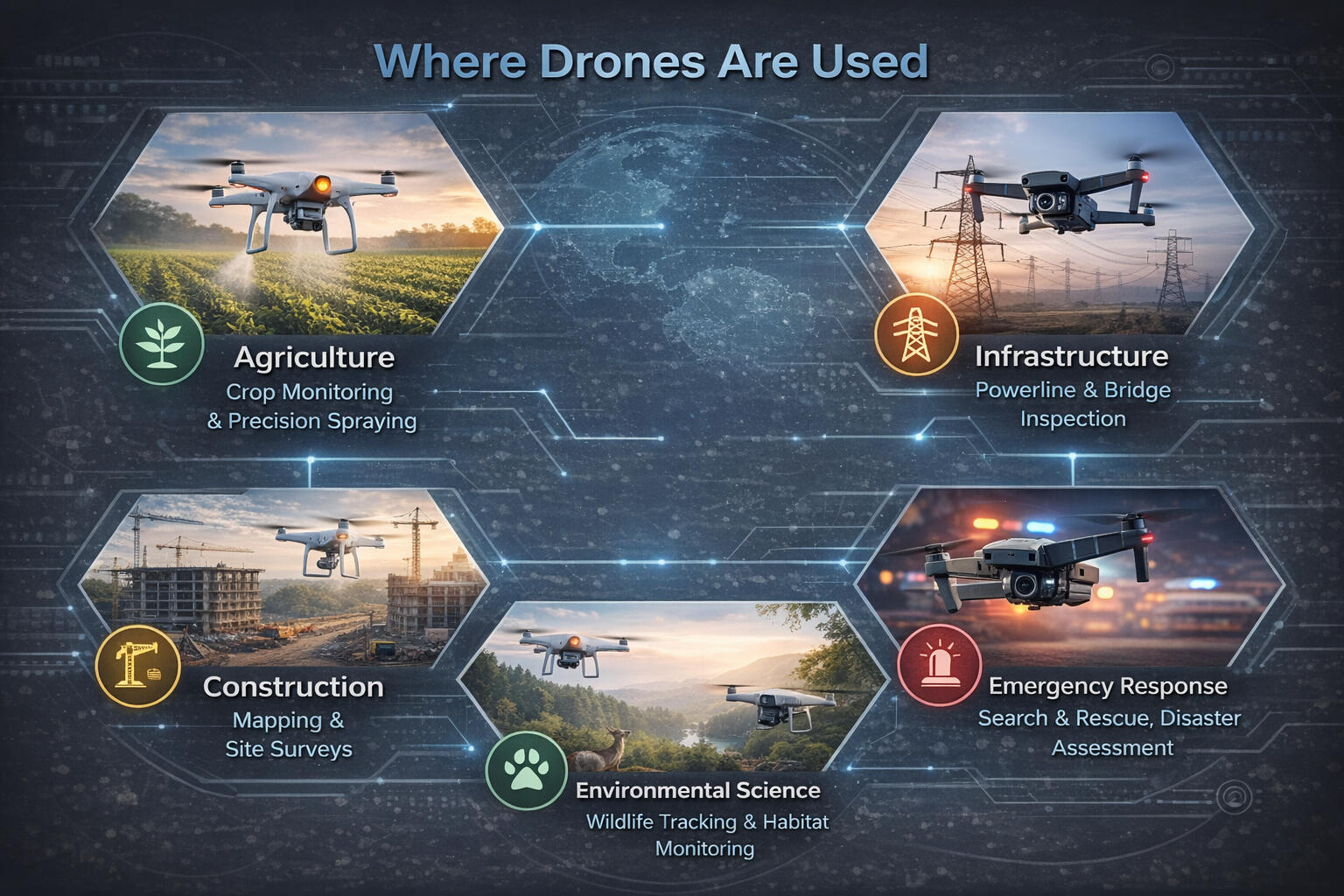 Drones support many industries and public services.